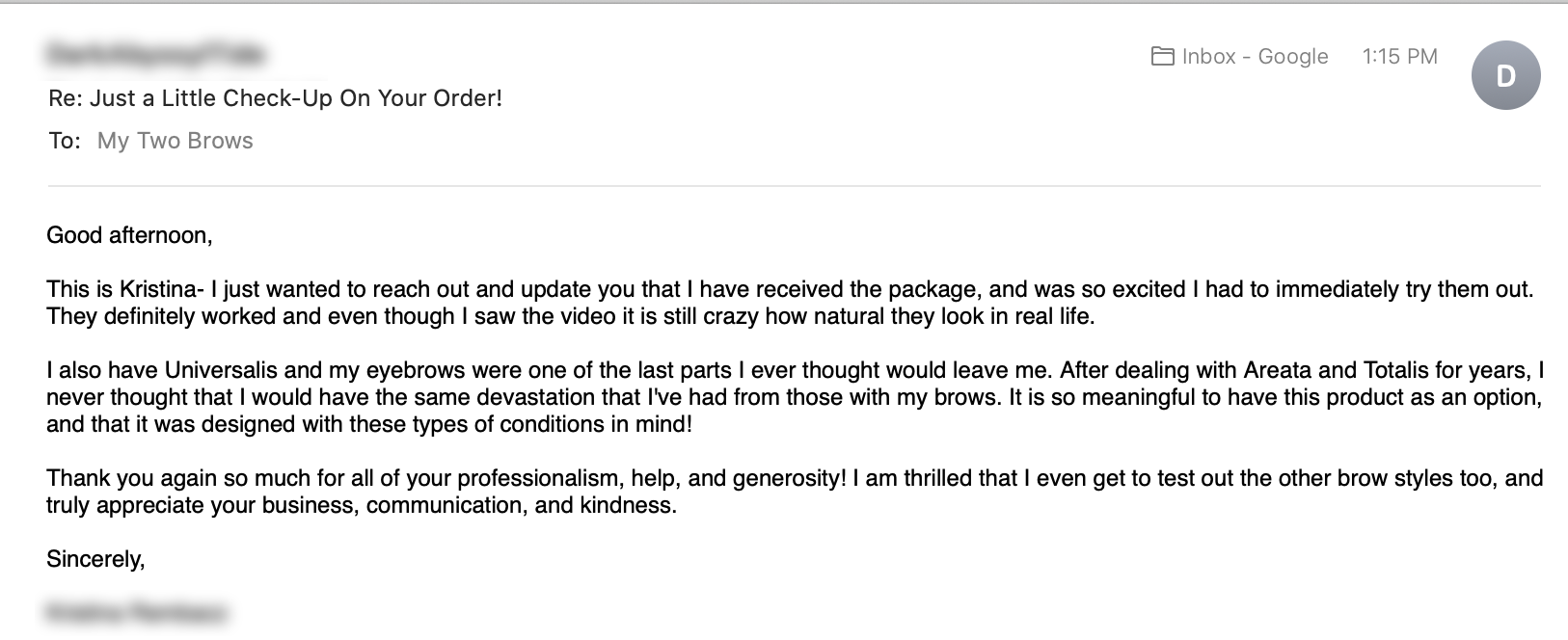I have Universalis and my eyebrows were one of the last parts I ever thought would leave me. After dealing with Areata and Totalis for years, I never thought that I would have the same devastation that I've had from those with my brows. It is so meaningful to have this product as an option, and that it was designed with these types of conditions in mind! The owner has been incredibly kind, communicative, and professional, and I will definitely be buying more when the time comes!"