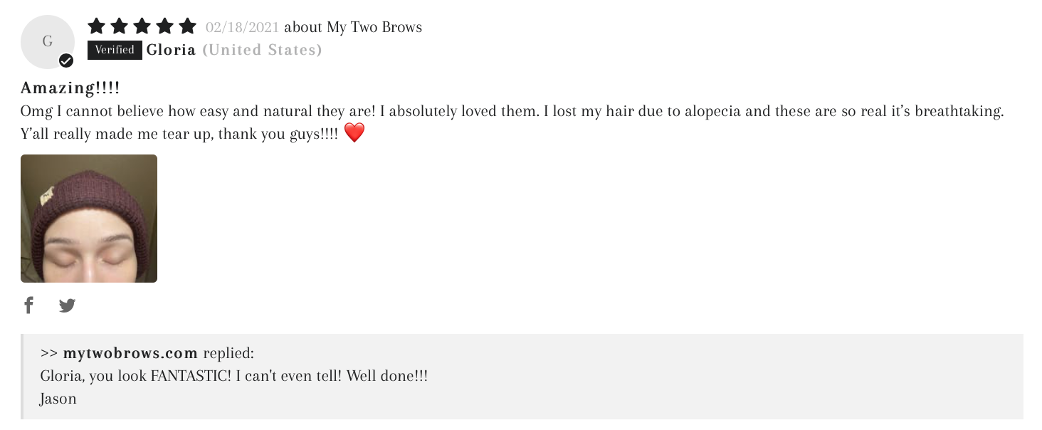 "Awesome brows, awesome service. I just subscribed because these are just what I need. I used to use eyebrow pencils but they would sweat off or come off in water. These look super real and sometimes last up to a week, even when I swim."